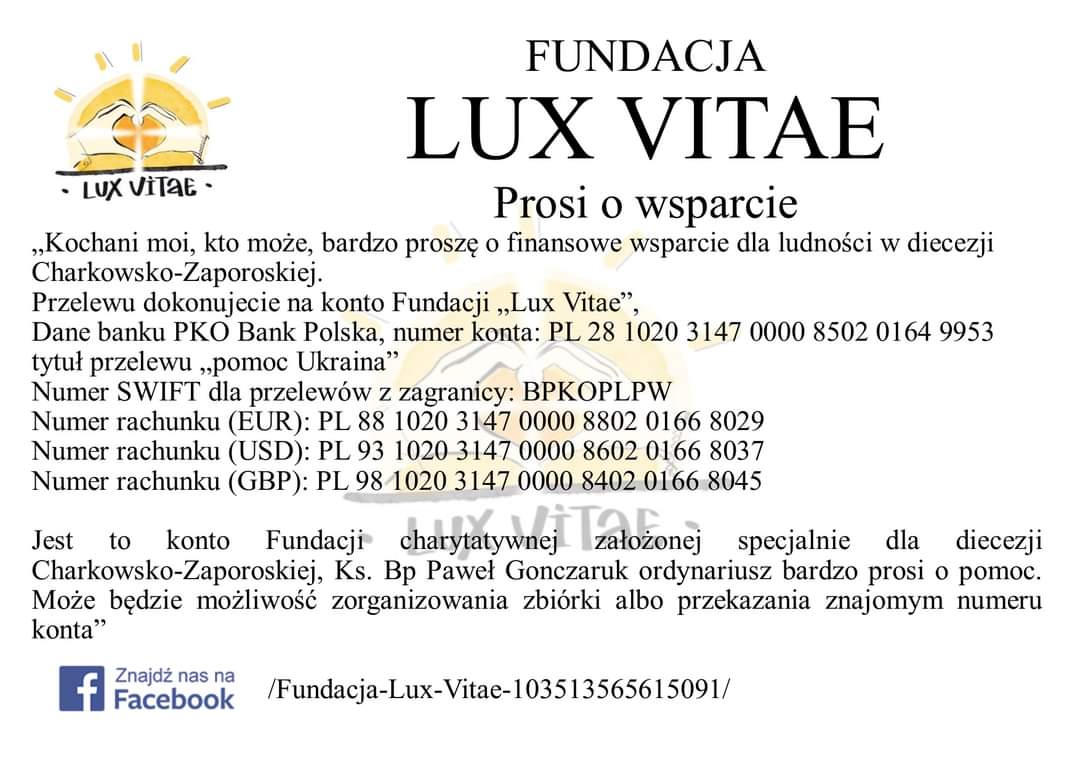 bardzo proszę o finansowe wsparcie dla ludności w diecezji Charkowsko-Zaporoskiej. Przelewu można dokonać na konto Fundacji „Lux Vitae”. Dane banku: