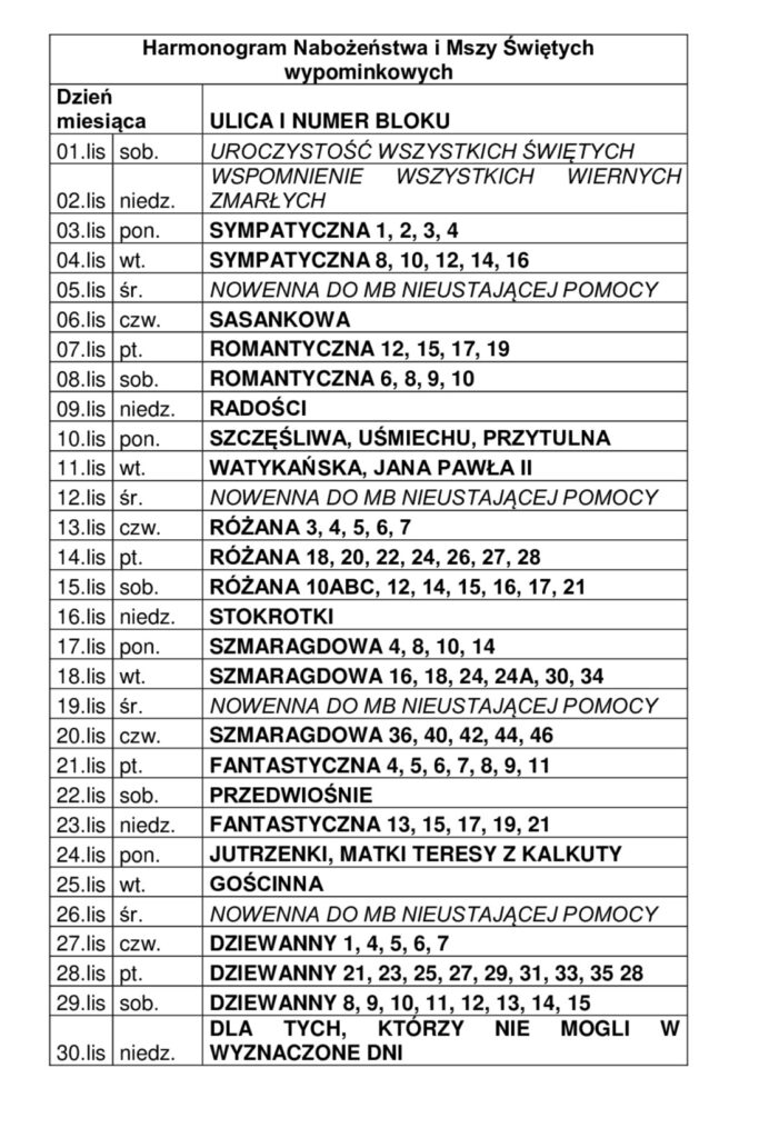 Poniżej harmonogram modlitwy wypomnikowej.
